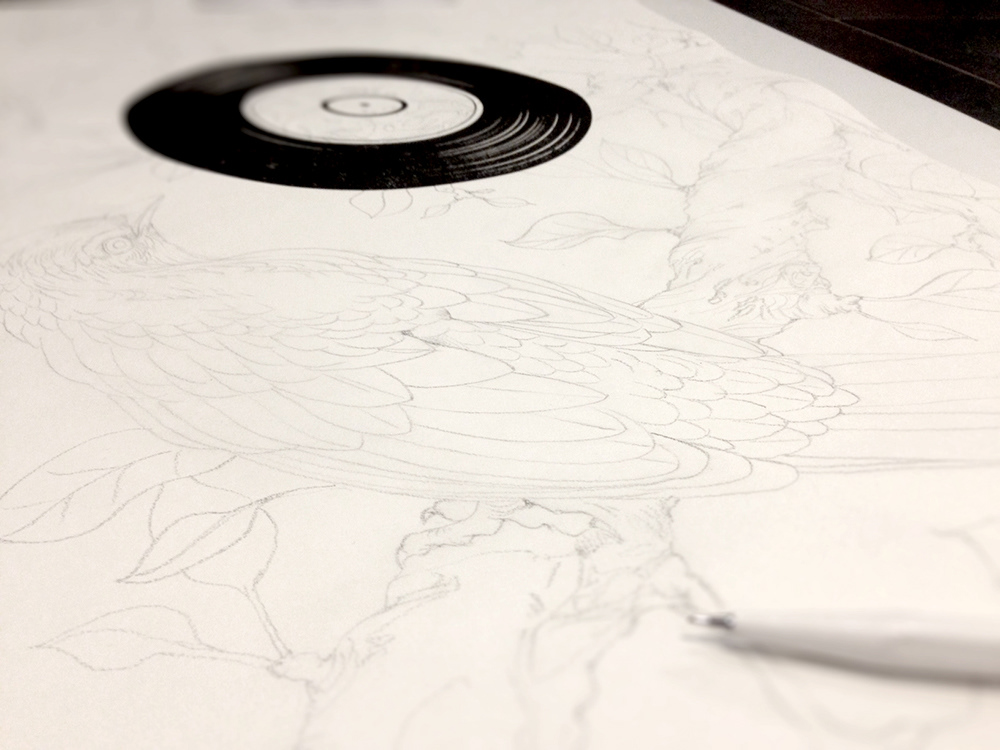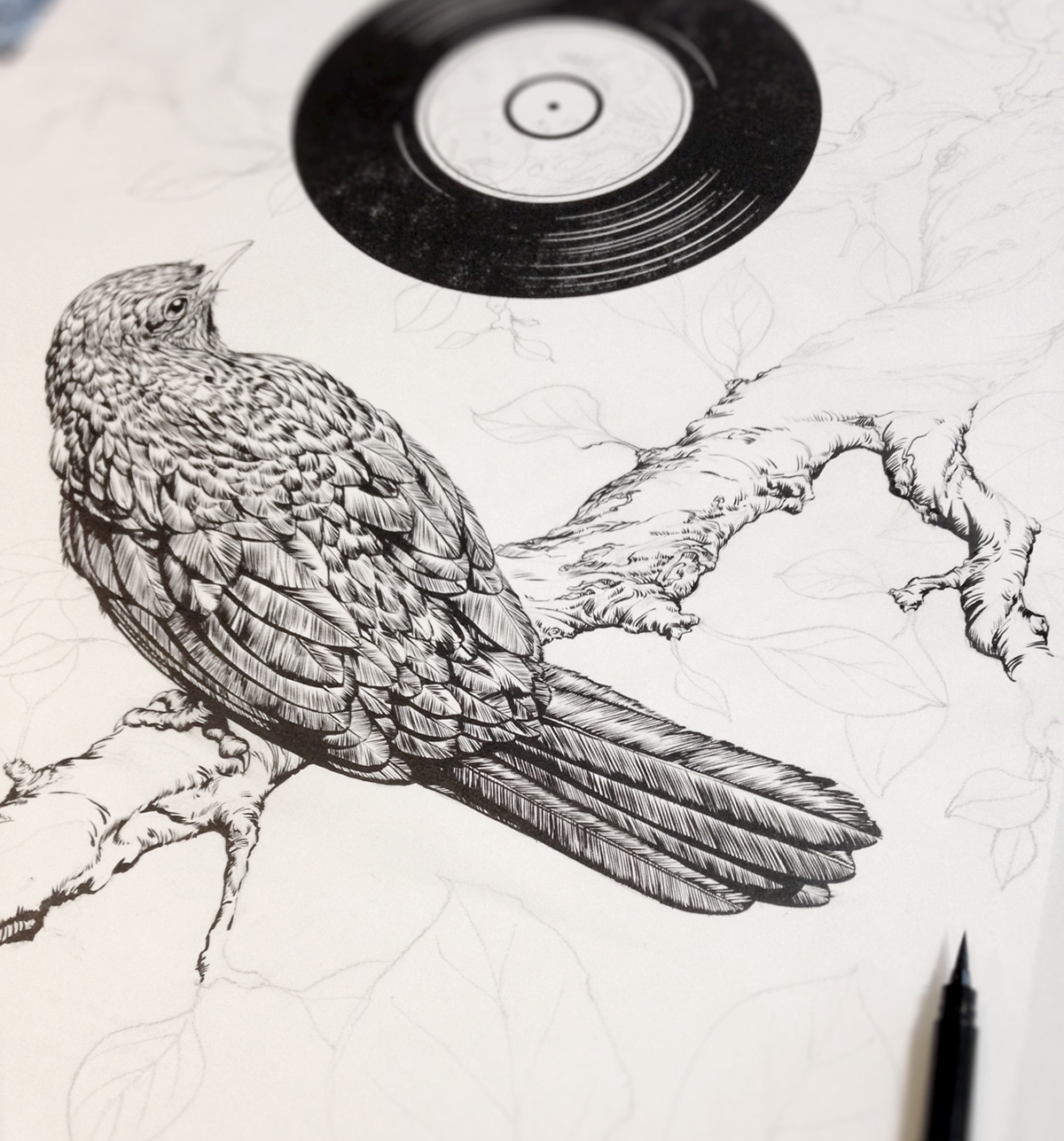 My design illustrates the Beatles song 'Blackbird' and incorporates the poster's original record motif within the bird's nest.